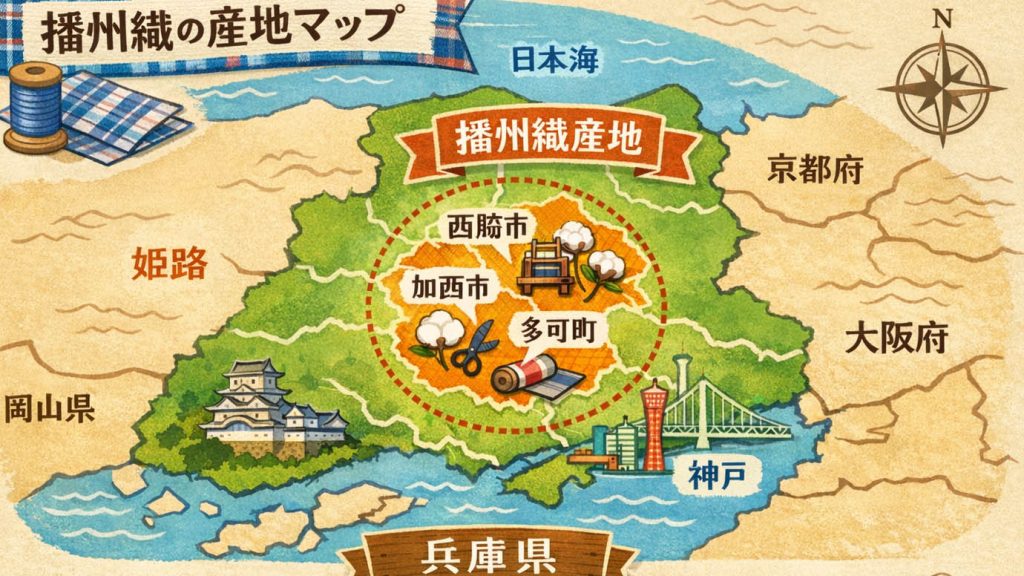 ・播磨織とは兵庫県北播磨(西脇市)の230年以上前から続く伝統の織物。江戸時代の中期、寛政4(1792)年、宮大工、飛田安兵衛が京都・西陣から織物製作の技術を導入したことが始まりと伝えられています。