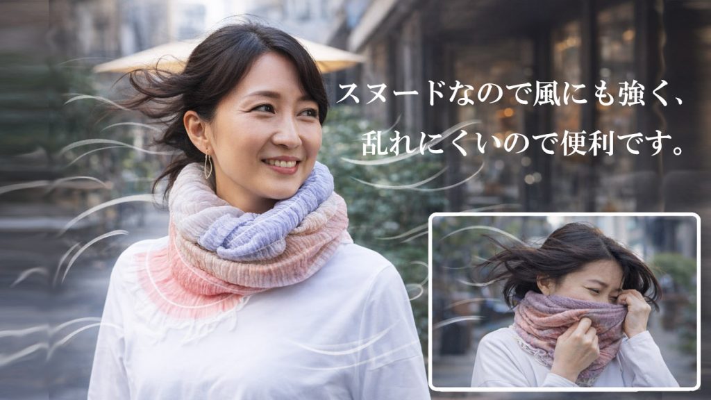 スヌードなので、風に吹かれても風に飛ばされないし、乱れにくいのでとっても便利。